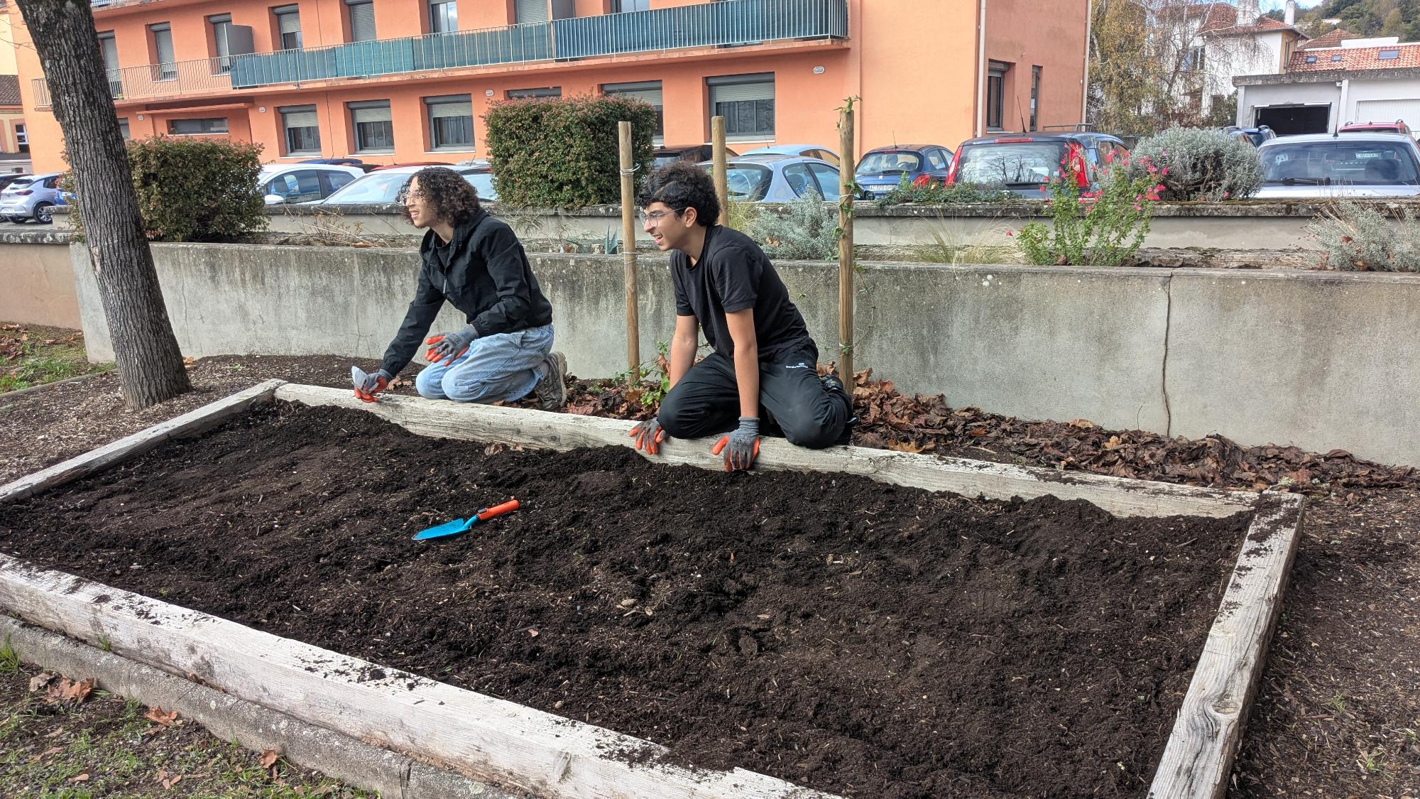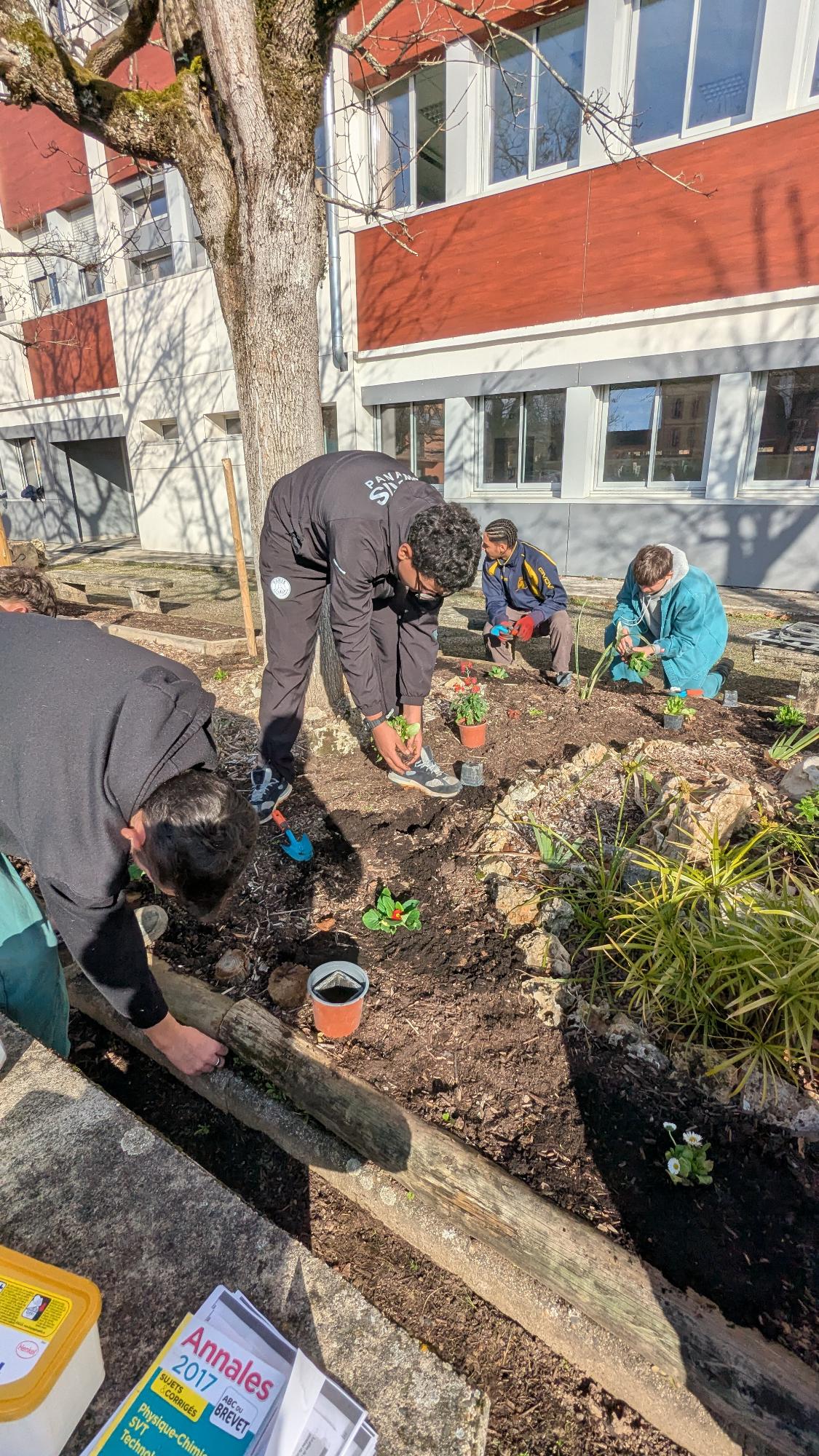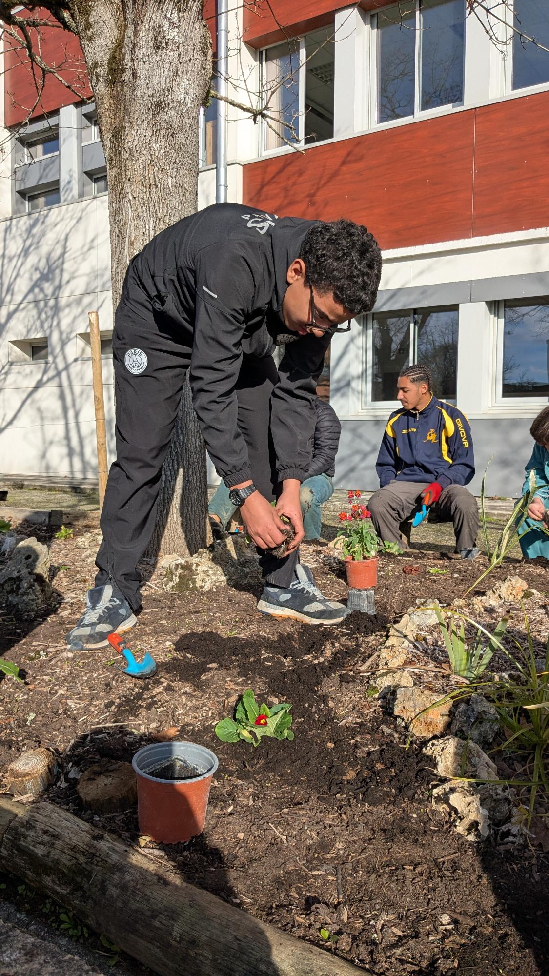 Les élèves du dispositif mini collège travaillent en collaboration avec les lycéens du LEPA de Moissac à l'entretien du jardin crée l'an passé par Mme Pouxviel et ses élèves de 6ème.